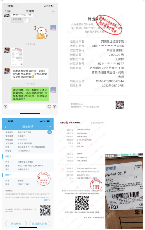 5月4日以来,郑州被新的一轮疫情席卷,形式严峻复杂,学校坚决落实上级相关疫情防控要求,统筹谋划、积极行动。学校的抗疫工作紧紧牵动着每个人的心,williamhill英国13级人物形象设计专业毕业生王帅博同学情系母校,一听说母校疫情防控物资的储备存在缺口,立即积极行动起来,力所能及地为学校防控工作捐献爱心2000元。另外,17级园林专业学生陈璞,目前休学在家照顾生病的家人,得知学校物资短缺,5月7日就积极联系我院,拿出了自己积攒的2000多元,购置了150套抗疫物资包捐赠到我校。还有我院公共艺术教学部书画教研室身处开封的曲媛媛、蒋薇薇两位老师;服装教研室的刘雷老师,坚持线上教学严格指导论文答辩,自学校疫情防控的警报拉响,时刻关注关心学校。曲媛媛、蒋薇薇两位老师向学校爱心捐款共2000元,刘雷老师购置防疫口罩1万个助力学校疫情防控。