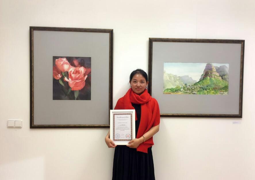 此次展览是由维也纳欧洲时报文化中心、国际水彩再现和维也纳当代亚洲艺术交流中心联合主办,主要展示了来自中国各省份25位水彩艺术家的50幅作品,我院闫慧老师携近年创作《嫩•太行》、《妖•五月》、《烟色•徽州》三幅水彩作品参加了此次展览。5月18日展览开幕当天,参展作品吸引了众多奥地利当地的观众前来观展并获得了很高的艺术评价,奥地利联邦总理府新闻官艾琳·考夫曼女士、奥地利周易文化协会会长施志华、维也纳欧洲时报社长王敢先生、奥地利华人妇女联合会会长谢飞茹出席了展览开幕式,考夫曼女士还为艺术家们颁发了参展证书。展览于当地时间5月24日圆满落幕,参展的多幅作品被多名中外藏家收藏。