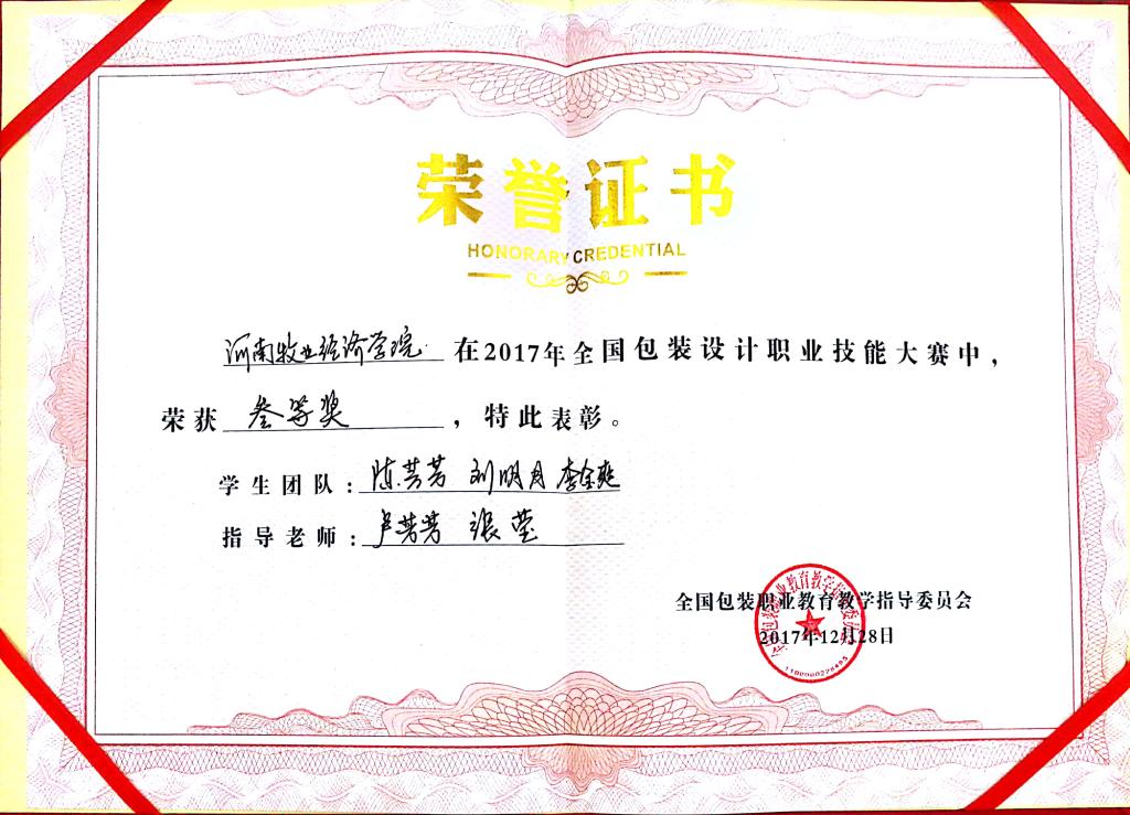 2017年12月28日,2017年全国包装设计职业技能大赛在中山火炬职业技术学院圆满落幕,我院和包装与印刷工程学院联合组队参加了本次大赛。张莹和卢芳芳两位老师共同指导的陈芳芳、刘明月(包印)李金爽(艺术)三名参赛学生经过激烈的角逐,在本次大赛中荣获三等奖。