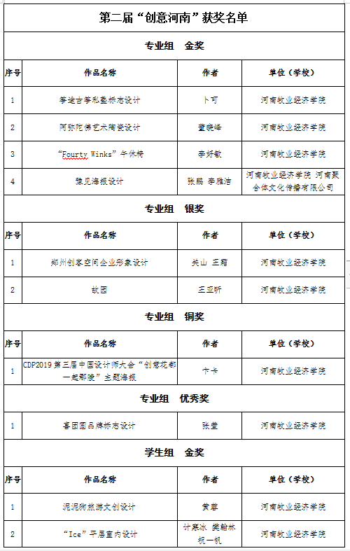目前,第二届“创意河南”主题作品艺术设计大赛(以下简称“创意河南”)获奖名单揭晓,我院成绩喜人,共获得专业组金奖4项、银奖2项、铜奖1项,优秀奖1项;学生组金奖8项、银奖6项、铜奖3项、优秀奖1项。卜可、董晓峰、卞卡、王霜、王亚昕、张莹等多名教师作品获奖;黄蓉、计寒冰、樊翰林、祝一帆、刘锦豪、冯露、唐唯盛、宋昊妍、刘明浩、宋泓辰、王蕊、李明瑶、谢旭升、岳辰羽、杨台琳珂等40余名学生作品获奖;王丽莉、田志涌、谭丛、李莉四名教师被评为“优秀指导教师”,李好敏老师被评为“最佳设计师”,我院被评为“优秀组织单位”。