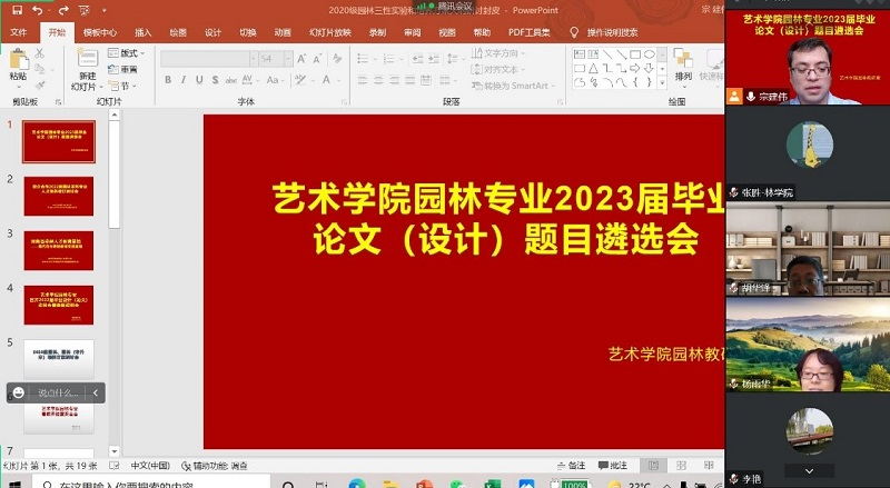 为切实做好2023届本科毕业生毕业论文(设计)选题工作,规范论文(设计)选题,确保毕业论文(设计)质量。2022年10月23日,园林专业通过腾讯会议顺利召开了2023届毕业论文题目遴选会。遴选会邀请西北农林科技大学硕士生导师张胜博士、我校社会服务办公室胡华锋主任在线指导。williamhill英国田志涌副院长、园林教研室主任左金淼老师、副主任宗建伟博士及园林教研室全体老师参加了遴选。