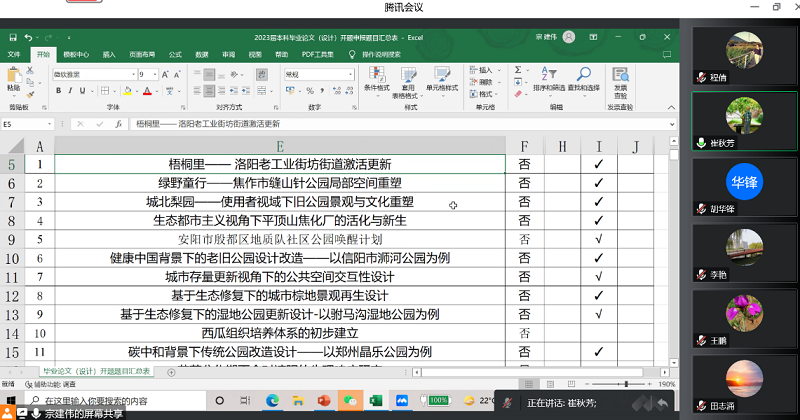 此次会议针对2023届所有学生毕业论文选题的合理性进行了审核,完全采用“盲审”形式,即全部隐去除论文题目之外的其他相关信息,完全根据论文选题本身的质量做出是否通过的决定。参会专家和教师从申报的128个题目中遴选了106个题目供园林专业2023届毕业生选择,专家和教师们经过讨论,严格评判,提出了建设性的改进意见与建议,以确保本届毕业论文选题紧密结合生产和社会实际,难度、工作量适当。本次毕业论文课题90%来源于实验、实习、工程实践和社会调查。园林专业毕业论文(设计)题目涉及到乡村景观、生态修复、园艺疗法、双碳与绿色发展、人居环境建设、生态植物资源等社会热点。专业选题主要紧密围绕着乡村振兴、生态文明、中华文化传承和美丽中国建设等方面开展工作。