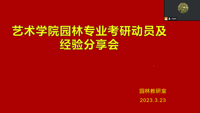 为激发考研学子的斗志,解答准备考研学子疑惑,把握考研信息动向,明确考研目标,谋划好未来“研”途,2023年3月23日晚上20:00-22:00,园林专业考研分享会线上如期举行,本次分享的考研专业为风景园林设计方向。分享会由宗建伟老师主持,特邀请17级李培瑶,18级的刘真真、黄培璐、杨玉瑶、马蕙菲同学向学弟学妹们分享考研备考经验。2020级和2021级园林专业学子参加了本次分享会。