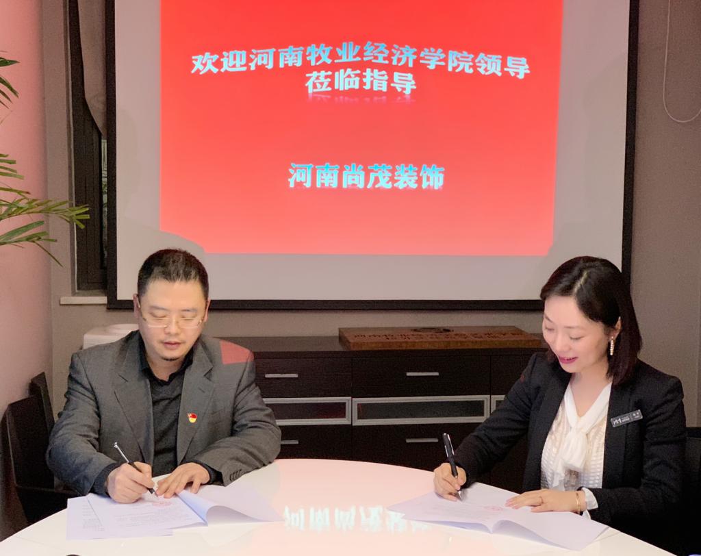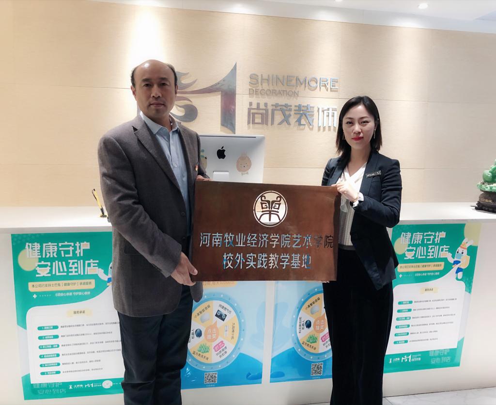 为深入推进产学结合教学模式的运行,为学生提供良好的实训实习平台,2020年4月24日下午,williamhill英国与河南尚茂装饰工程有限公司校企合作签约仪式在尚茂公司举行,尚茂公司总经理刘进婷、设计总监张大磊、williamhill英国王在钦书记、张鹏院长、田志涌副院长、环境设计教研室主任谭丛、副主任李莉参加签约挂牌仪式。