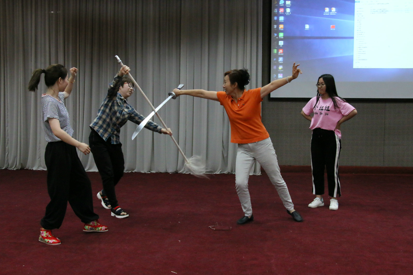 涂玲慧教授从中国传统文化的角度讲解了戏剧艺术的起源与发展,带领大家学习了我国戏曲渊博的发展历史。她还向大家展示了珍贵的元代戏曲演出壁画图,让同学们有机会了解到数百年前的戏曲演出现场。通过典型人物形象、经典剧目、戏曲视频等内容的展示,在场的师生领略了戏曲的特有魅力。涂教授与河南艺术职业学院的杨洛宁老师一起,通过现场演示,为同学们表演和讲解了唱、念、做、打的要点。一折扇、一挥袖、一扬鞭,经典的戏曲做派水袖、走马、耍花枪从荧屏走向舞台,引得现场师生连连叫好;舞蹈化的形体动作与武打技艺二者相互结合,引得全场阵阵掌声。最后,涂教授总结说“艺术并不是高高在上,艺术就在我们身边。即使你不是戏曲专业的人员,对艺术的学习也可以潜移默化的浸润一个人气质,希望传统艺术文化在你们这一代的身上能传承发扬。
